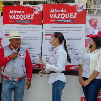 El candidato a presidente municipal de Panotla por el partido Redes Sociales Progresistas (RSP), Alfredo Vázquez Zempoaltécatl, inició campaña en la comunidad de San Jorge Tezoquipan, donde prometió destinar el 50% de su salario en caso de llegar a la alcaldía para atender las necesidades de las comunidades que integran el municipio.