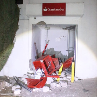 Del que pendía un cable (roto) de acero de calibre considerable, y que la otra parte de la linea estaba sujeta al cuerpo metálico de un cajero automático de color rojo bermellón (del Banco Santander), que se observaba destrozado y parcialmente retirado del espacio pequeño; donde estaba empotrado, del que también su canceleria sufrió afectaciones por la visita de los desconocidos malhechores.